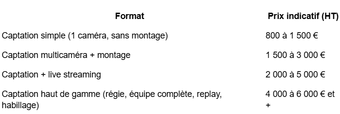 Quel est le prix moyen d’une captation événementielle en 2025 ?